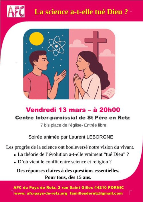 Vendredi 13 mars : A St Père au centre inter paroissial à 20h soirée organisée et animée par Laurent Leborgne. Le thème abordé sera : « La science a-t-elle tué Dieu ? » La rencontre cherchera à comprendre si la théorie de l’évolution, qui a profondément changé notre manière de voir le monde vivant, remet réellement en cause la foi en Dieu. L’objectif est d’apporter des éclairages simples et accessibles sur ces grandes questions. La soirée est ouverte à tous, à partir de 15 ans.