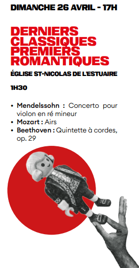 Programme : Ce concert nous fera entendre la sublime voix suspendue de Raquel Camarinha, nommée aux Victoires de la musique classique, dans des airs célèbres de Mozart. Hugo Meder, l’un des talents les plus marquants de là nouvelle génération française jouera le Concerto pour violon de Mendelssohn en re mineur. Le concert s’achèvera par le lumineux Quintette à cordes op. 29 de Beethoven.