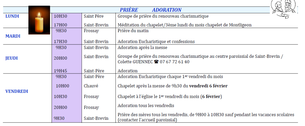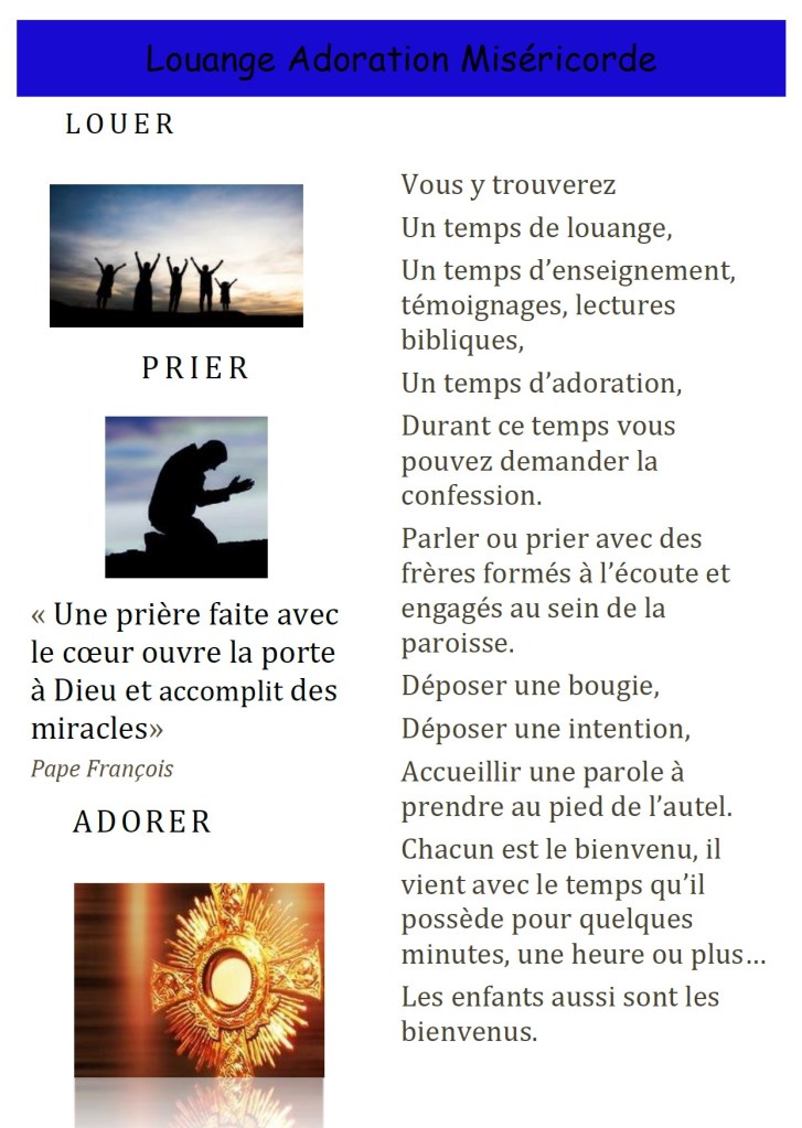 - Adoration eucharistique, le vendredi à 9h30 à St Père, chaque premier vendredi du mois dans la chapelle