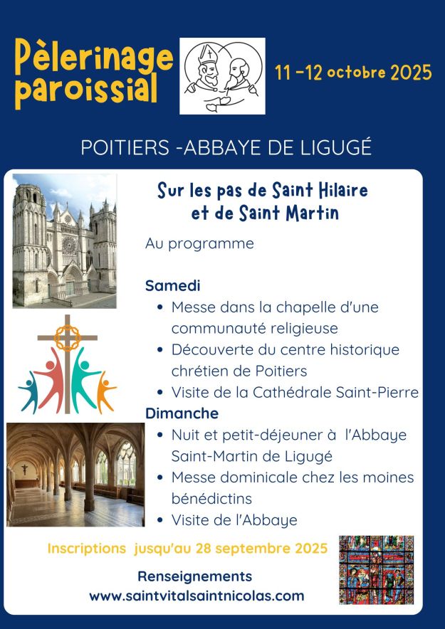 Un pèlerinage inter paroissial « Sur les pas de Saint Hilaire et de Saint Martin » vous est proposé les 11 et 12 octobre prochains. Au programme : visite de la cathédrale et du centre chrétien de Poitiers. Nuit, petit déjeuner et messe dominicale à l’Abbaye de Ligugé.